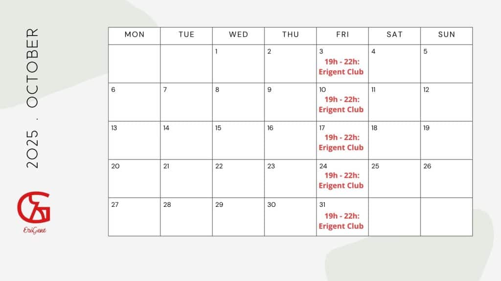 - Wekelijks is er “EriGentClub” op vrijdagavond. Hierboven vind je de agenda.